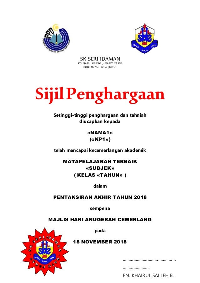 Human translations with examples. Human translations with examples. 13 Anugerah Mata Pelajaran Terbaik 14 Pencapaian Sekolah Sepanjang Tahun 2017 - 2018 15 Sekalung Budi Hadiah dan Sijil telah diberikan pada 16 November 2018 Titip Bicara.