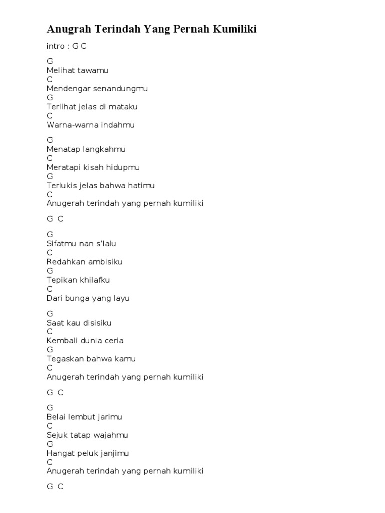 F Sifatmu kan selalu F redakan ambisiku Am Tepikan khilafku dari F bunga yang layu F Saat kau di sisiku F kembali dunia ceria Am Tegaskan bahwa kamu F Anugerah terindah yang pernah kumiliki F Belai lembut jarimu F Sejuk tatap wajahmu Am Hangat peluk janjimu F Woo. Intro G C G C G Melihat tawamu C Mendengar senandungmu G.