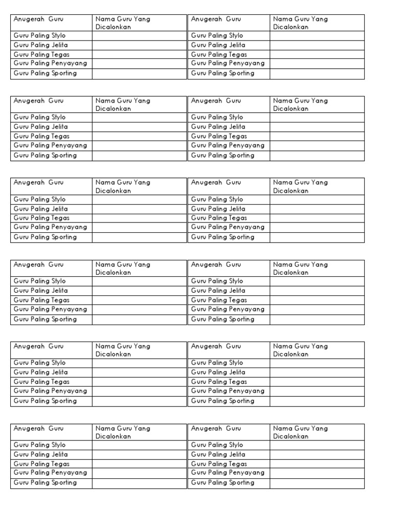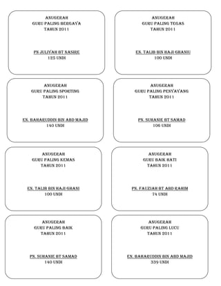 Anugerah Guru Paling Popular lelaki perempuan Perlawanan boling antara guru-guru. Senarai Penerima Anugerah Khas Guru Bil Nama Anugerah 1 Guru Paling Awesome 2 Guru Paling Patriotik 3 Guru Paling Mesra Alam 4 Guru Paling On Time 5 Guru Paling Kreatif 6 Guru Paling Inovatif 7 Guru Paling Sporting 8 Guru Paling Stylo 9 Guru Paling Sempoi 10 Guru Happy Go Lucky 11 Guru Paling Serius 12 Guru Paling Cool 13 Guru. TEKS UCAPAN PENGACARA MAJLIS SEMPENA SAMBUTAN HARI GURU.